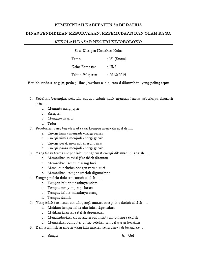 Contoh Soal Ulangan Kenaikan Kelas Tema 5 Kelas 2 SD